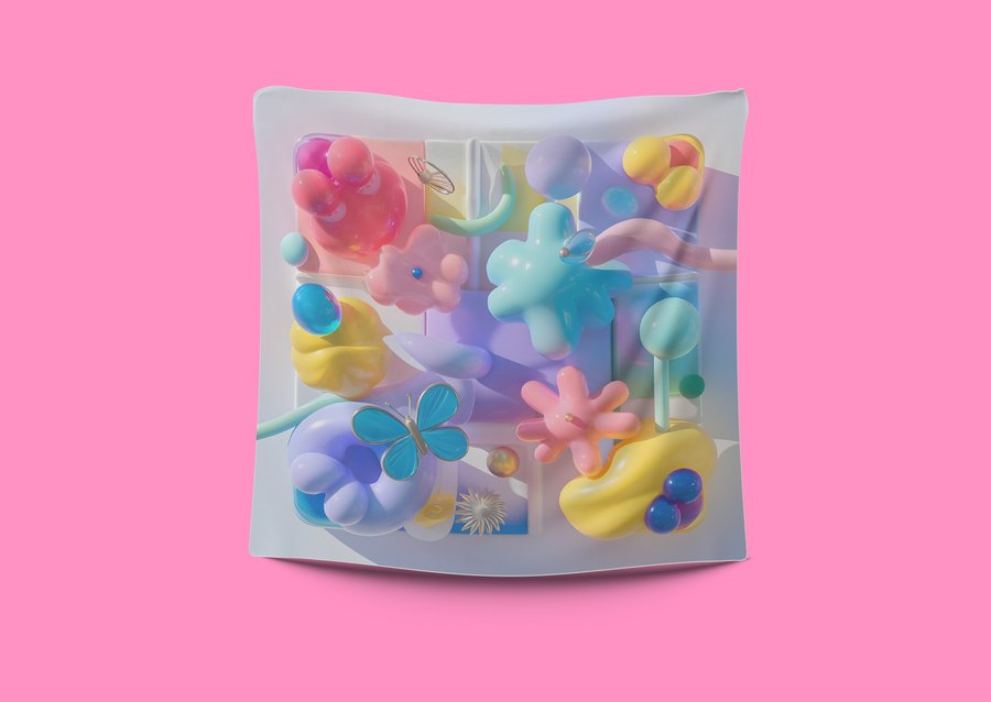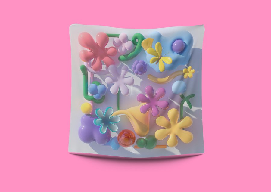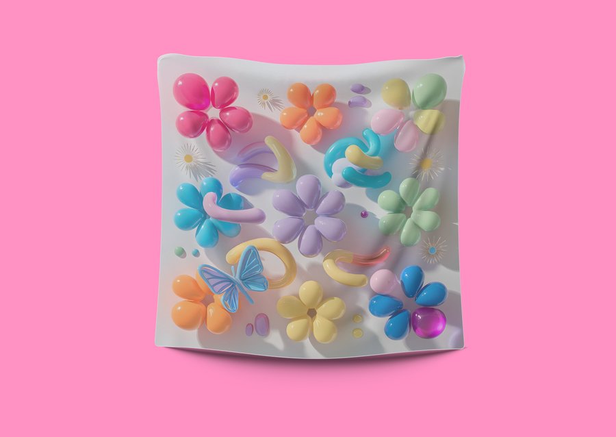 Промпт: Create a square illustration depicting abstract multicolored glass flowers with a smooth, gradient, bright look, with various rounded and wavy shapes. Use light saturated, pastel and bright colors such as pink (#FF92C3), purple (#D489EE), blue (#06E3FF), yellow (#FFF85A). Objects should have complex gradients. The background should be solid white to emphasize the brightness of the elements. Make sure the overall design is modern, playful and visually appealing, with a clean and abstract aesthetic. White backgrounds should have no shadows. lightness, naive vibe. 3d render. Использованные инструменты: Ideogram, Upscayl