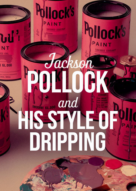 Промпт обложки: A vintage-style advertising picyures with the text «Jackson Pollock and his style of dripping». There are several cans of paint with the brand name «Pollock’s Paint» in the background. A brush and a palette are also visible. The background is a beige colour.