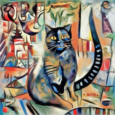 Чекпоинт-250 (при общем числе шагов тренировки 500) начинает добавлять в изображения сглаженные черты кубизма Шагала, но все же является очень далеким родственником стиля, к которому мы стремимся