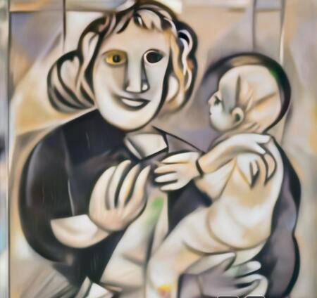 Промпт — painting in SHAGAL style, a blonde woman in black with a child on her hands