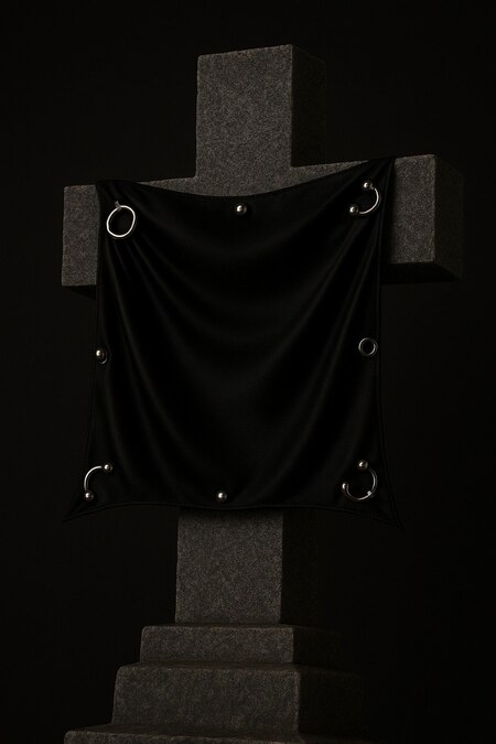 Промт: сгенерируй шелковый платок черного цвета (#000000) без принта. Платок должен быть с металлическими пирсинагми, сконцентрируй внимание на качестве их материала. Сделай платок большим, углы платка острые, сделай материал из которого он сделан тонким и блестящим.