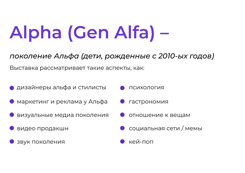 В рамках модуля наша группа работала над выставкой «Gen Alpha», затрагивающей культуру, ценности и увлечения поколения, родившегося после 2010 года, ведь именно оно в ближайшие десятилетия станет ключевым потребителем на рынке.