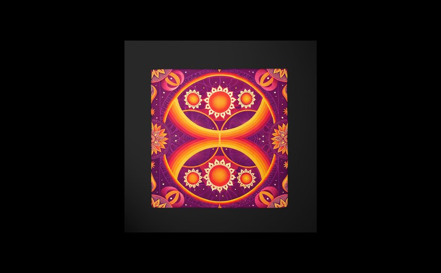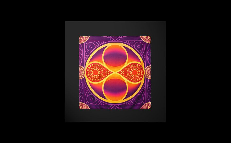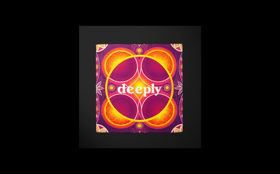 Create a flat square scarf print design for a project called «deeply». Visual language is based on soft glowing auras, emotional energy fields, and rich gradients. Use a deep purple background with bright magenta, orange, and yellow aura-like circular blends. Centered or balanced serif typography in white (inspired by retro fonts like Cooper).
