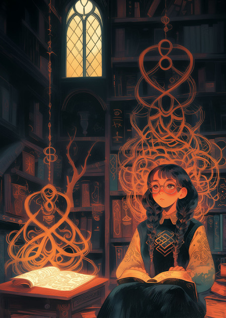 Promt: Fantasy school student sits in a library chair. Student have hair weaved in braids and glasses. Student wears school uniform. Background is a library, decorated in art nouveau style. On the desk lays open textbook, which depicts defferent types of magic knots. Student looks attentively into the book. Knots are handdrawings, made in art nouveau style. There is a lot of thread patterns in the library decor. detailed ghibli anime style --s 250 --niji 6 --ar 56:83
