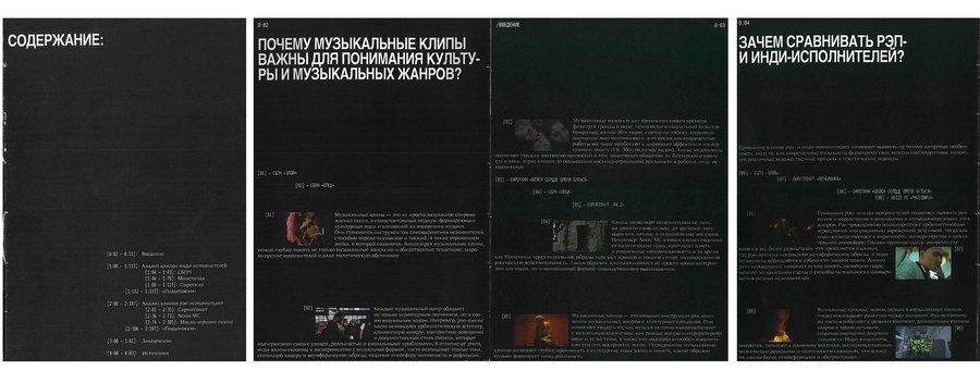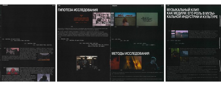 Гипотеза данного визуального исследования: несмотря на кардинальные отличия в жанровой принадлежности, музыкальные клипы российских рэп- и инди-исполнителей используют схожие визуальные приёмы. Границы между этими жанрами становятся все более размытыми, и их визуальные нарративы нередко пересекаются, создавая единое пространство самовыражения.