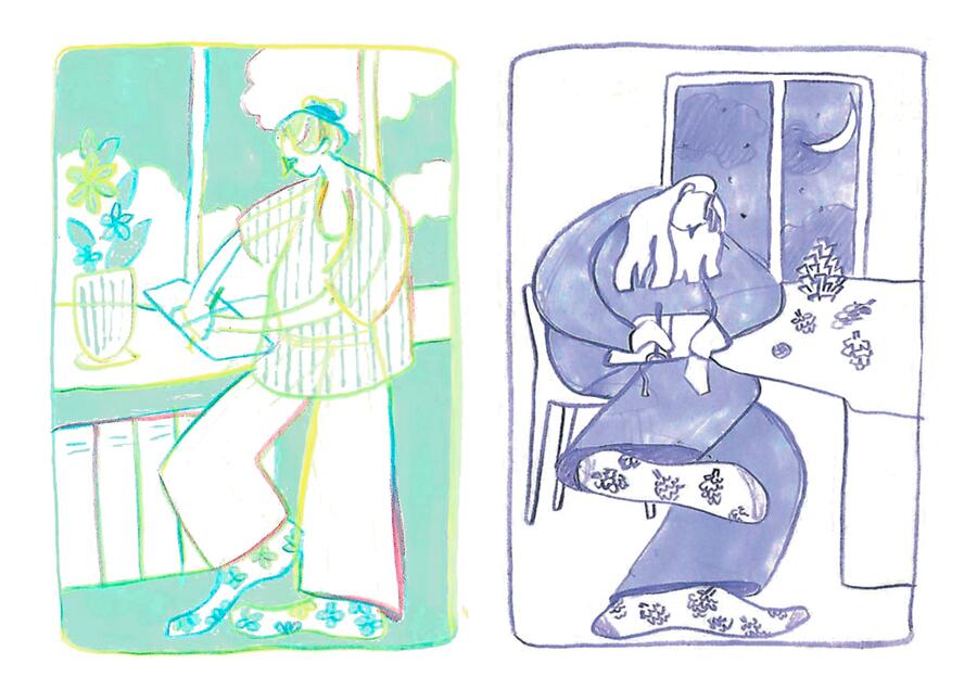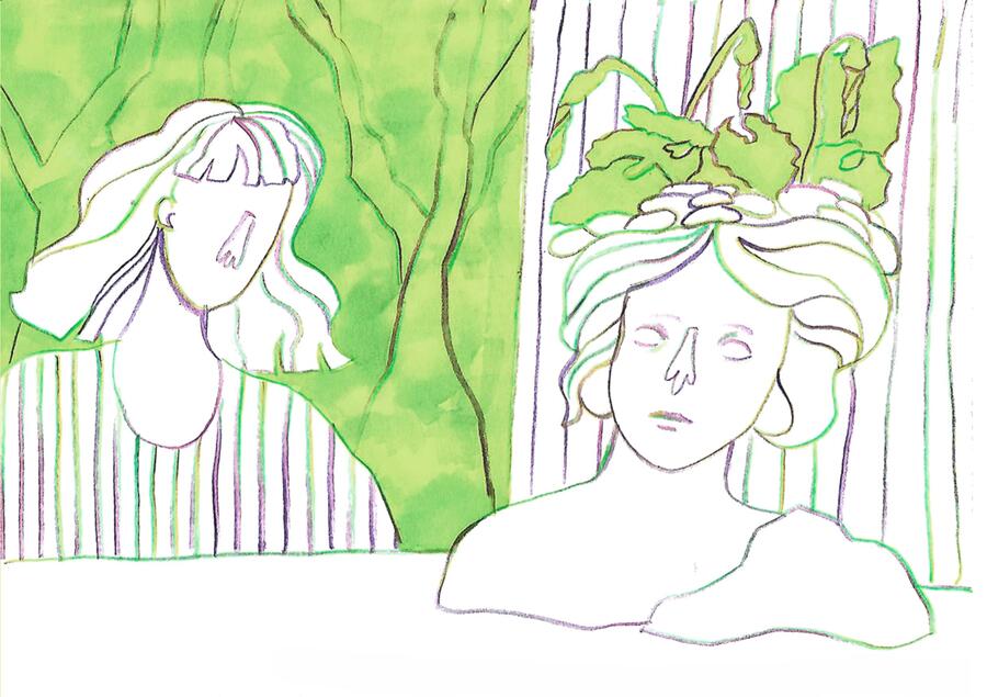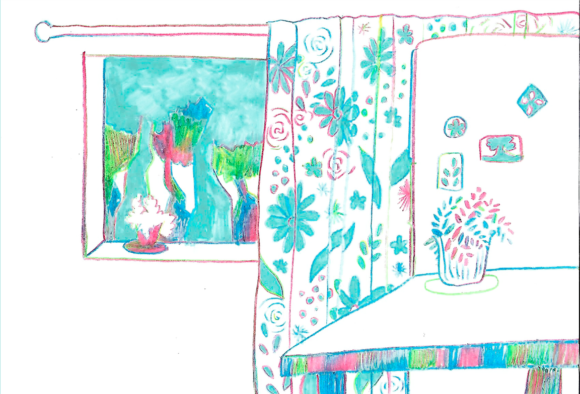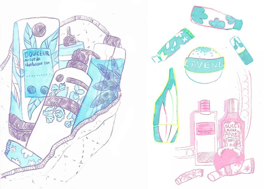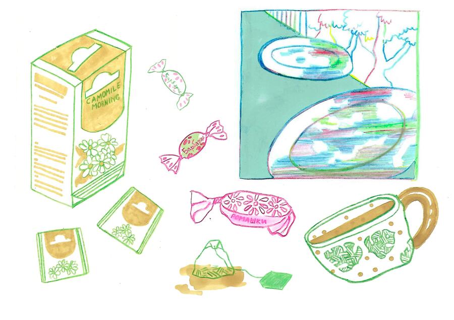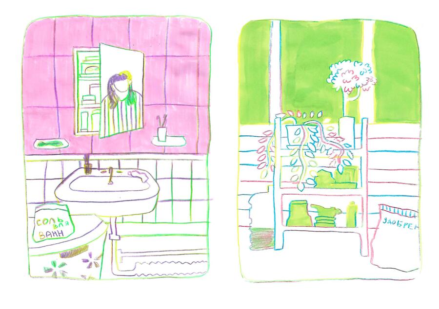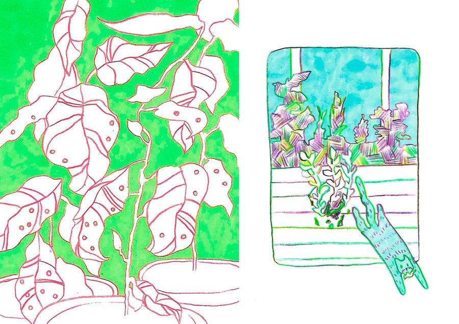 «Сад в моей квартире» — это зин о взаимодействии людей с растительным миром в условиях отдаления человека от него. Я обращаю внимание на то, как природа проникает в наши дома через цветочные принты, косметику, продукты и так далее. В результате рисунки становятся отражением неразрывной связи между человеком и растениями.