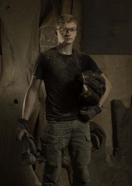 Идея заключается в съемке героев, на лице и одежде которых слой деревян- ной пыли и стружки. Я попросил каждого из мастеров изготовить простое деревянное изделие. Кроме этого, мне интересен не только объект, который сделает мастер, но и деревянные отходы производства, которые возник- нут в процессе работы.