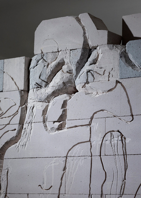 Монумент, созданный из белых пористых каменных блоков в память о прошлом, также отражает горе. Контуры, выбитые в камне, стекаются вниз, превращаясь в кровавые каменные слезы, которые остаются у его основания. Эти слезы, полные боли и отчаяния, безнадежно существуют, никому не нужны, подобно бесполезным камням. На обратной стороне памятника звучит заглушенный вопль, пронизывающий пространства.