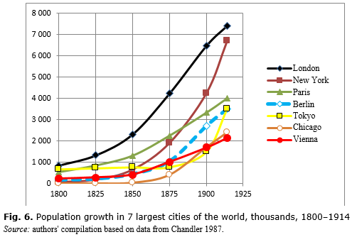 На графиках можно заметить экстремальное увеличение численности населения крупных городов за последние 100 лет, а также большой рост ВВП на фоне промышленной революции.