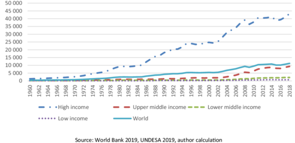 Мировой ВВП в триллионах долларов США / Число городов мира с населением 300 тысяч человек и более по размеру
