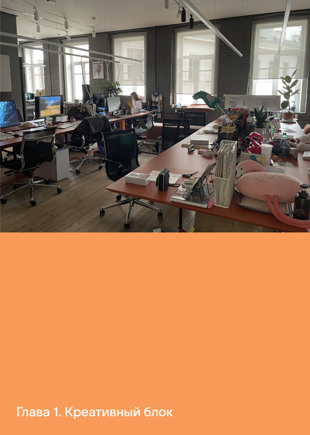 Глава устроена как последовательность микрокейсов: каждая фотография и таблица читаются как небольшой «портрет» рабочего места, а в совокупности они показывают, какие визуальные и материальные решения особенно характерны для креативного блока, как в нём сочетаются производственные задачи и попытки создать устойчивый, узнаваемый и эмоционально насыщенный фрагмент профессиональной среды.