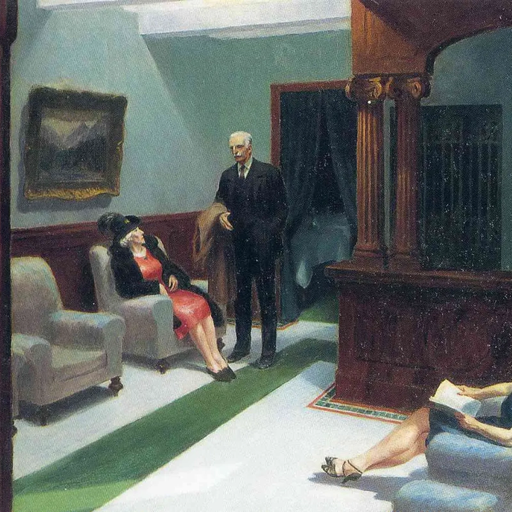 Получившиеся изображения, по моему мнению, точно передают визуальную стилистику Эдварда Хоппера, описанную мной в предыдущем разделе, воссоздавая его характерные приёмы — изоляцию, молчаливую драму и напряжённую статичность. Одинокие фигуры людей погружены в размышления или ожидание, не взаимодействуют друг с другом, что подчёркивает атмосферу отчуждённости. Важнейшую роль играет свет: направленный, контрастный, он формирует композицию, выстраивает эмоциональный акцент и создаёт ощущение «остановленного момента». Пространство построено строго и геометрично — с чёткими линиями архитектуры, окон, рельс. Цветовая палитра приглушённая, с тёплыми и мягкими тонами, усиливающими чувство тишины и отстранённости. Эти работы получились не просто стилизованными под Хоппера — они передают его главное художественное качество: повседневность как внутреннюю драму, они глубоко погружены в его художественную систему, воспроизводя не только формальные приёмы, но и эмоцию его творчества: напряжённое молчание повседневности.
