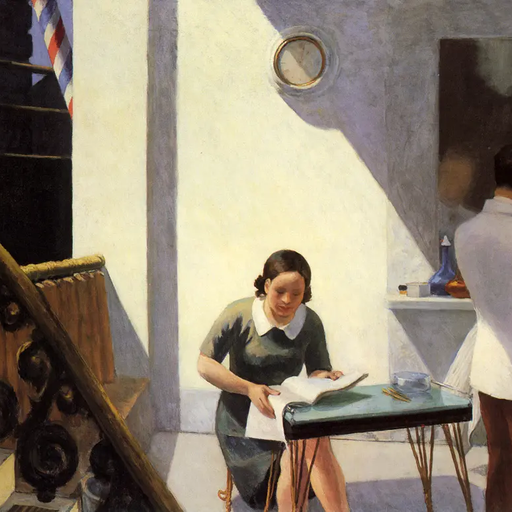 Отдельного внимания заслуживает минимализм в деталях: художник сознательно избегает избыточной декоративности, сводя окружение к необходимому минимуму. Такое визуальное сдерживание позволяет сосредоточиться на главном — на эмоции, моменте, атмосфере. Именно в этих почти пустых интерьерах и безлюдных улицах особенно сильно чувствуется статичность хопперовского времени — это не просто момент, это остановленное течение жизни, мгновение между событиями, наполненное скрытым содержанием.