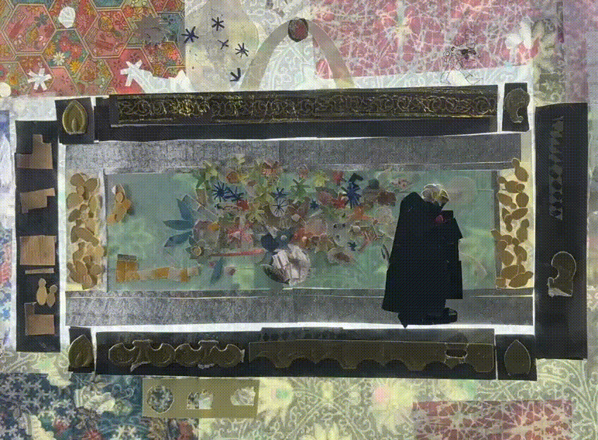 Работа сочетает аналоговый подход с цифровой обработкой, создавая образ, который будто бы оживает внутри музейной экспозиции. Поверх натюрморта- Параджанов воссозданный из его же эстетики- оживает, идёт к зрителю и символически «открывает» самого себя. Он принимает мир таким, какой он есть и в ответ дарит своё внутреннее. Его творчество становится подарком миру, оставленным навсегда.