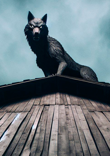 «A dark room in an old house, a wooden staircase on the side, moonlight in the window. Creaky wooden floorboards. In the center of the room stands a creepy wolf, eyes glowing white. The wolf is walking»