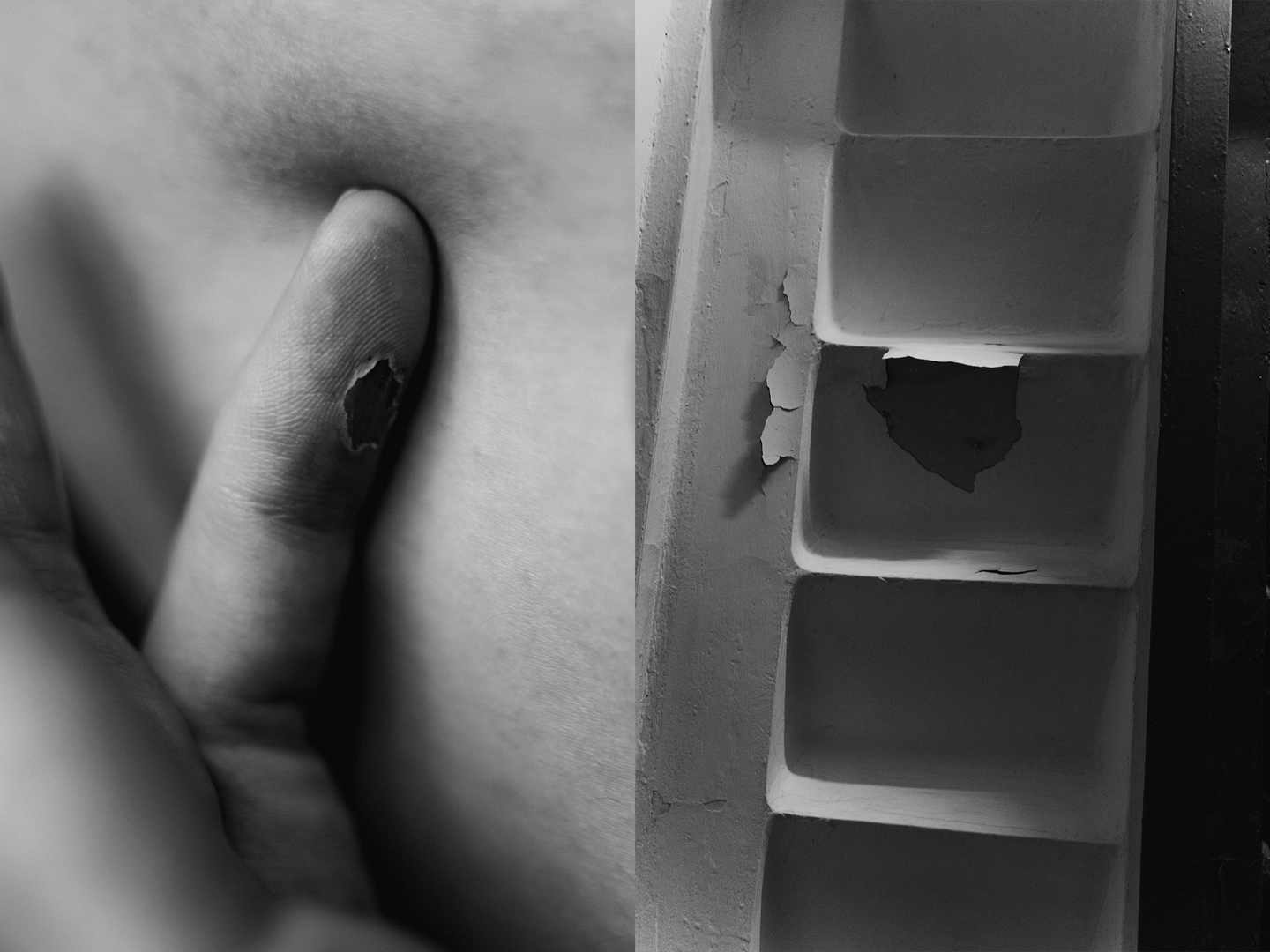 Серия работ, выполненных в технике сухой иглы, инспирирована следами на стенах, которые остаются от мебели, годами стоящей на одном месте. Контуры, которых всё это время не касался свет, контрастируют с выгоревшими обоями.