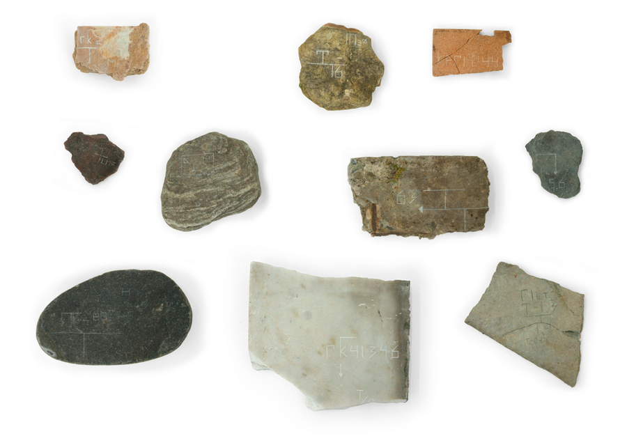 Гравировка на найденных на улице камнях создает «следы» настоящего времени. Они превращаются в странные и мистические артефакты.
