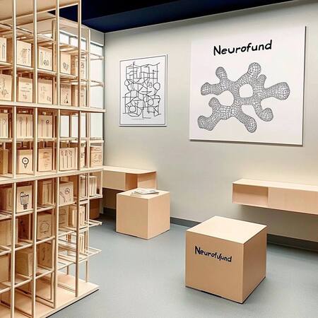 /imagine prompt: Creative black beige and white poster hanging on a white wall for the «Neurofund» brand that helps neurodivergent people find a work --chaos 20 --stylize 350 --weird 1000 --v 6.1