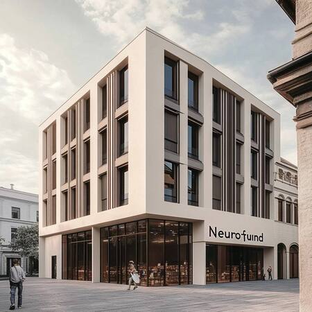 /imagine prompt: exterior of the building in light colors for the «Neurofund» brand that helps neurodivergent people find a work --chaos 20 --stylize 350 --weird 1000 --v 6.1
