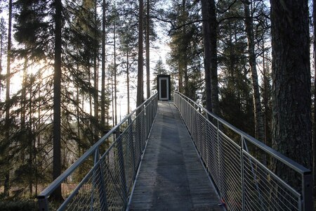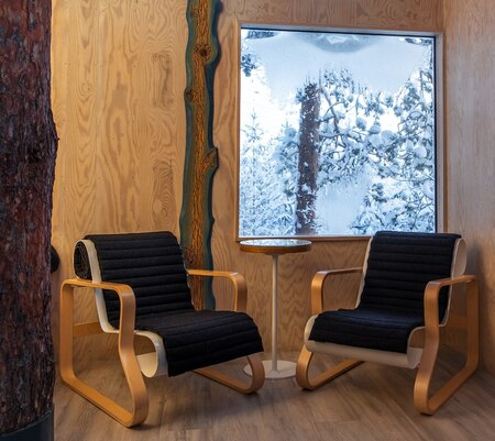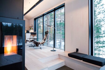 Концепция: Деревянный дом на дереве, где местоположение играет центральную роль. Возможность посетителя почувствовать себя частью леса, находясь высоко среди сосен, откуда открывается величественный вид на окрестности. Проект также отсылает к резким контрастам естественного освещения на севере Швеции, где тёмный фасад контрастирует со светлым интерьером.