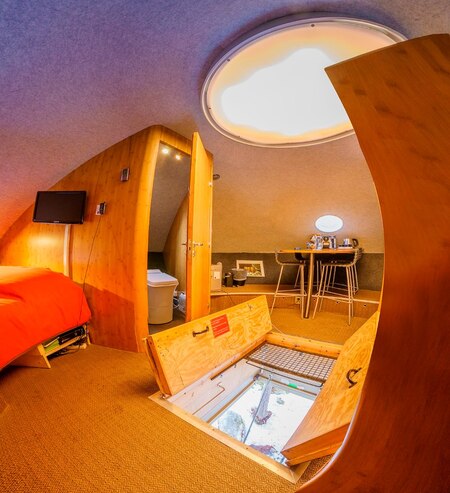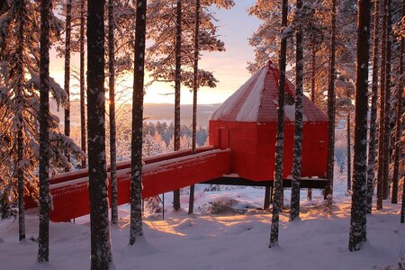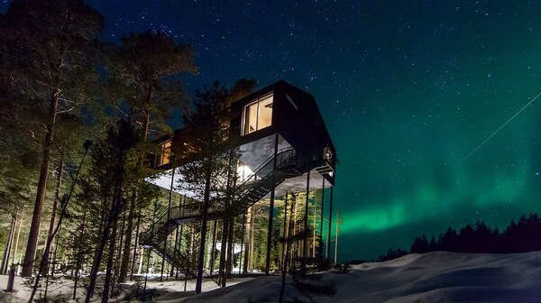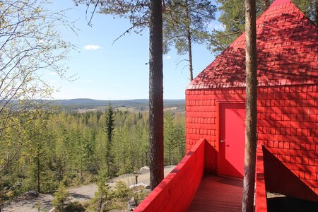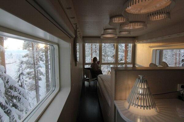 Все номера гостиницы «Tree Hotel» расположены на высоте 4-6 метров над землёй среди верхушек деревьев. Каждый номер представляет собой уникальное дизайнерское решение с мебелью ручной работы от местных дизайнеров и архитекторов.