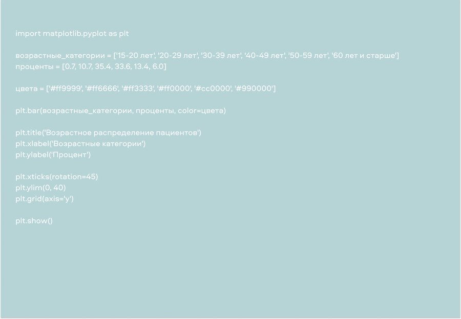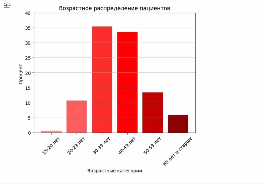 С помощью гистограммы понятно, что больше всего людей с заболеванием ВИЧ в возрасте от 30 до 39 лет, а меньше всего у людей от 15 до 20 лет