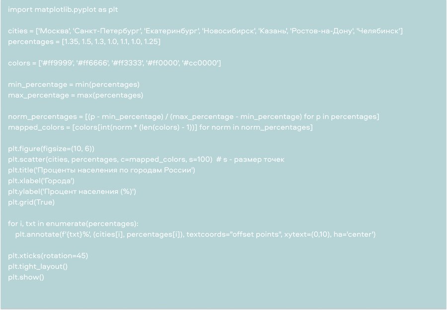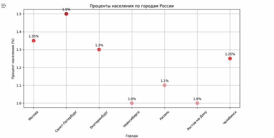 Точечная диаграмма показывает, что в Санкт-Петербурге самый большой процент заболевших. На втором месте по числу жителей с заражением в Москве.