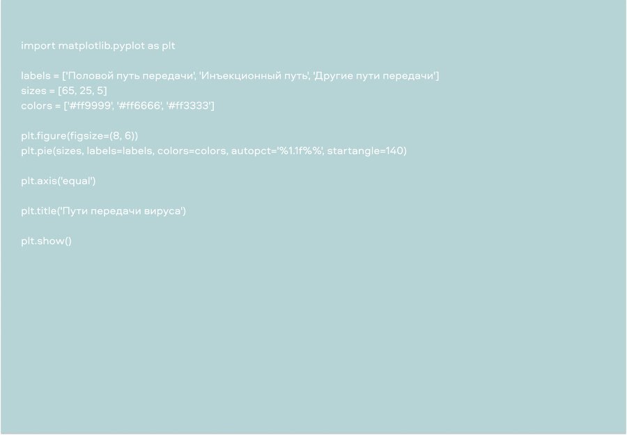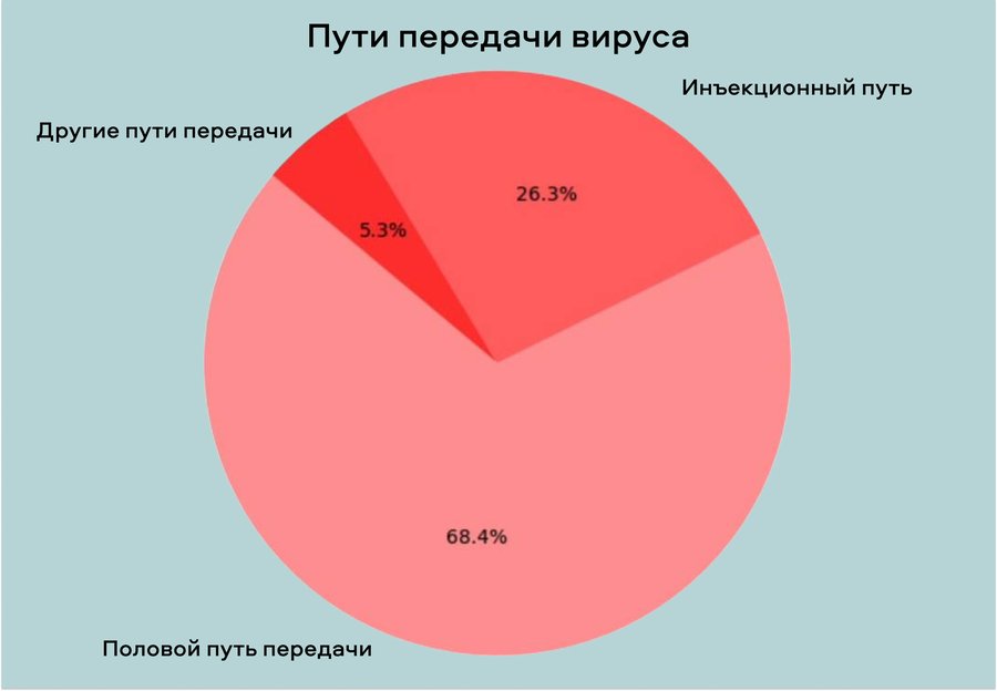 Круговая диаграмма показывает, что 68,4% передачи ВИЧ произошло половым путем.