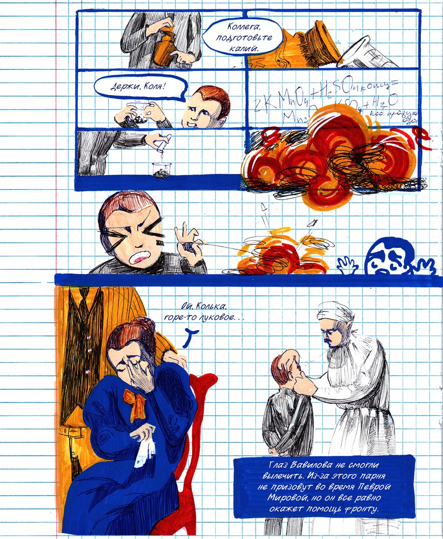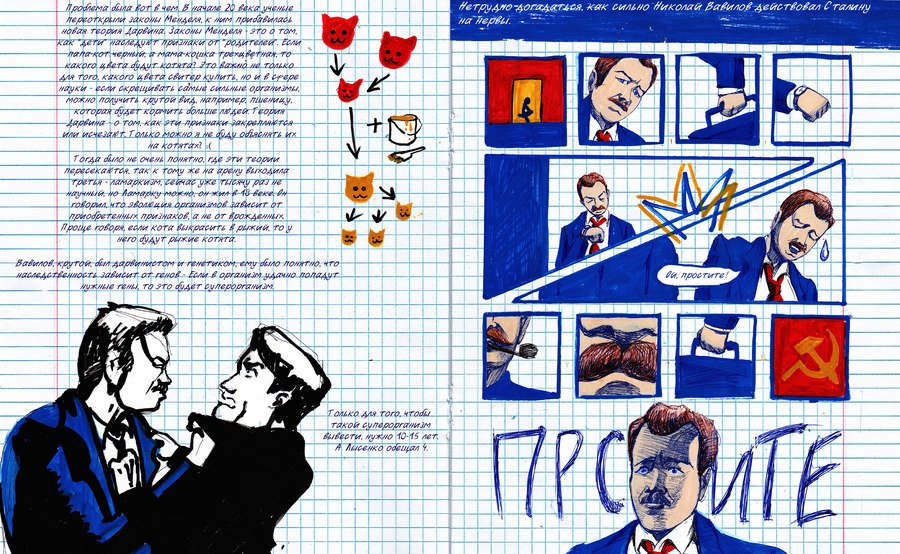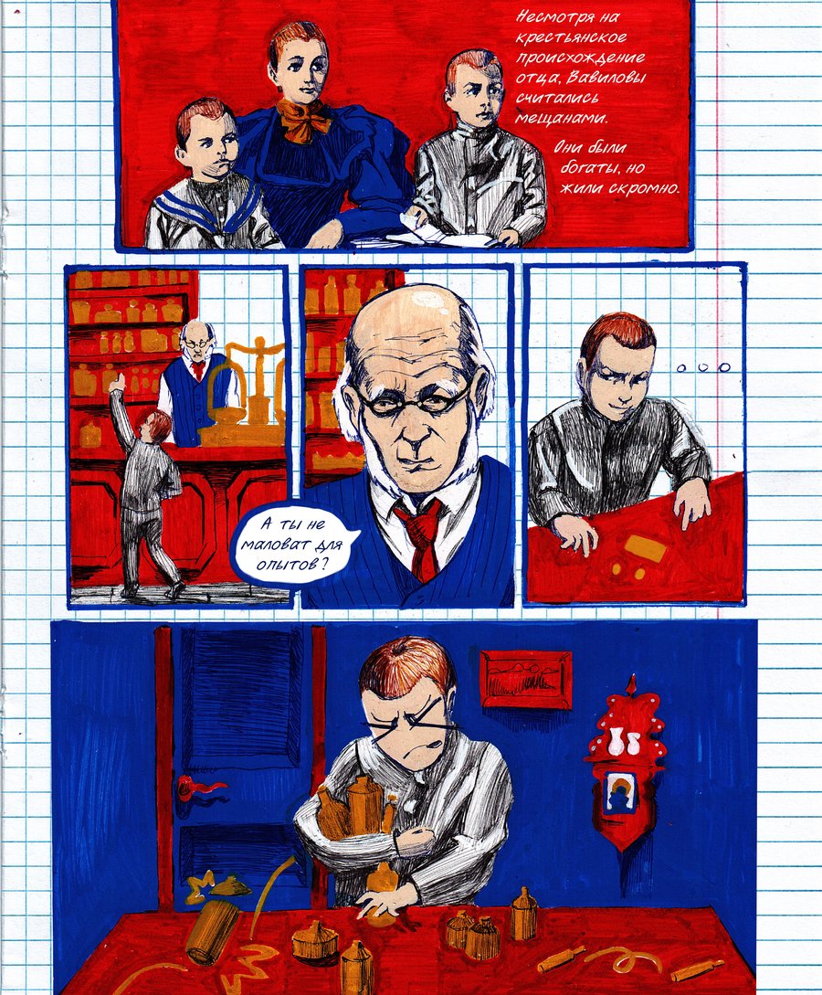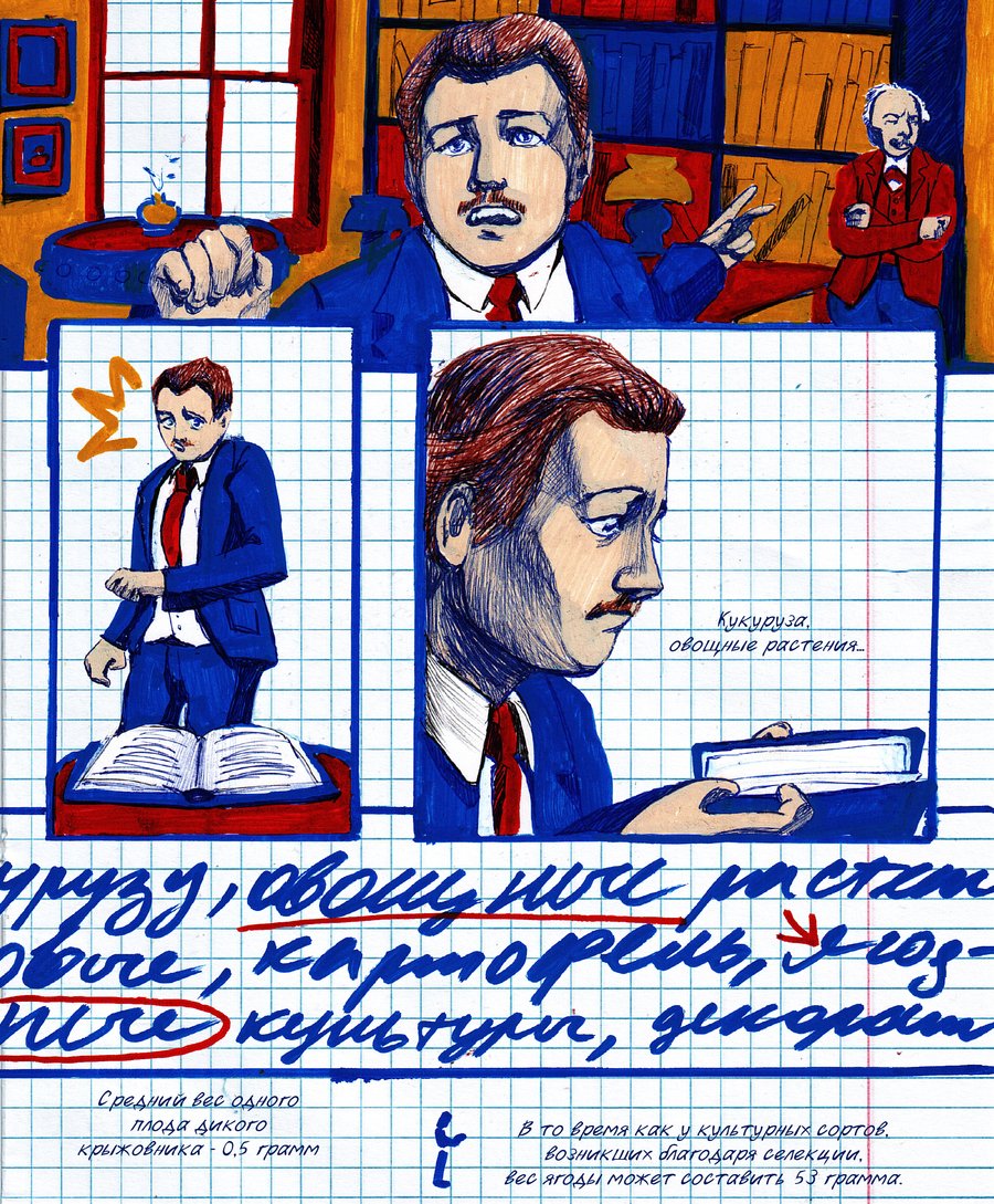 В школе я хотела стать биологом, но отказалась от этой цели, поняв, что даже лучшие ученые часто проигрывают в схватке с лженаукой. Позже выяснилось, что мои друзья поступили так же. Какого же это — принять вызов ученого и бороться с мракобесием ценой своей жизни? Мой комикс как раз о таком человеке — Н. И. Вавилове. В качестве домашнего задания школьник Лёва пишет о нем сочинение и знакомится с великим генетиком впервые.