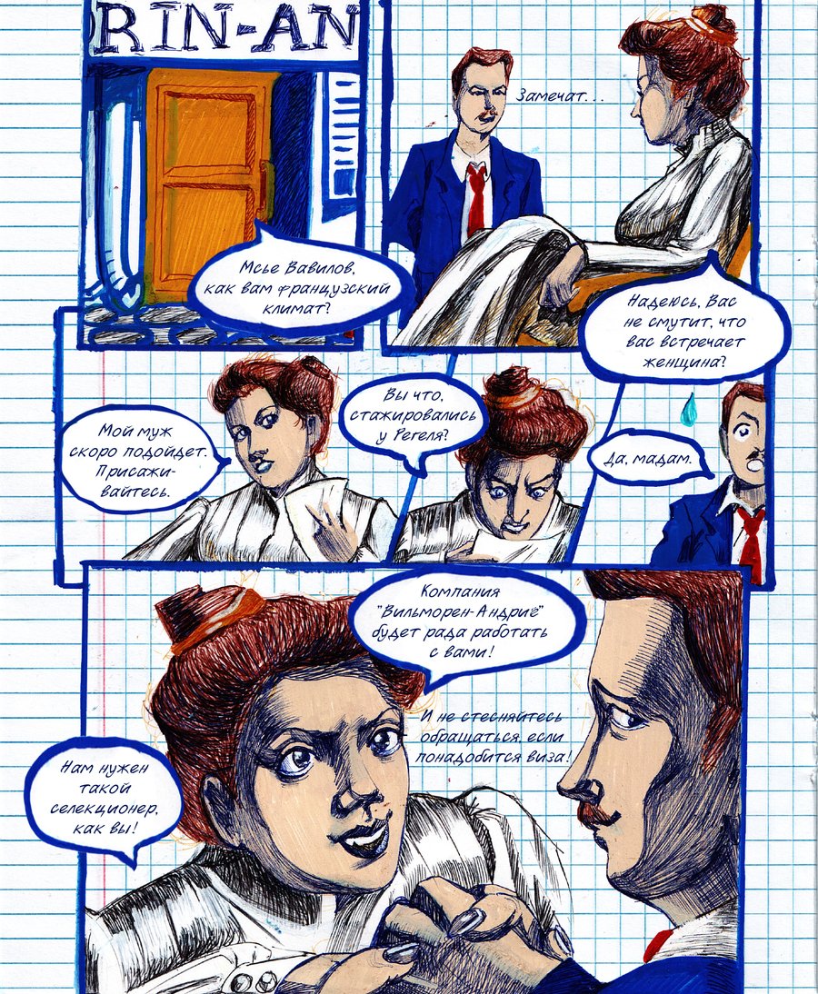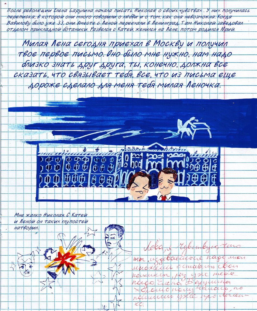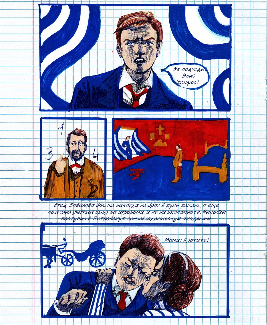 В школе я хотела стать биологом, но отказалась от этой цели, поняв, что даже лучшие ученые часто проигрывают в схватке с лженаукой. Позже выяснилось, что мои друзья поступили так же. Какого же это — принять вызов ученого и бороться с мракобесием ценой своей жизни? Мой комикс как раз о таком человеке — Н. И. Вавилове. В качестве домашнего задания школьник Лёва пишет о нем сочинение и знакомится с великим генетиком впервые.