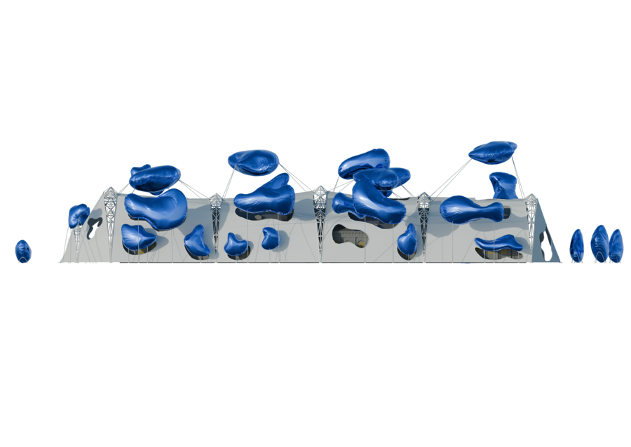 Архитектурный фасад выполнен по принципу тентовой конструкции, где основой служат прочные металлические фермы, обеспечивающие устойчивость всей структуры. В натянутой ткани фасада вырезаны отверстия, которые символизирует утрату и глубокую боль. Эти дыры — не просто декоративные элементы, а глубокие метафоры человеческих переживаний, отражающих утрату и опустошение.