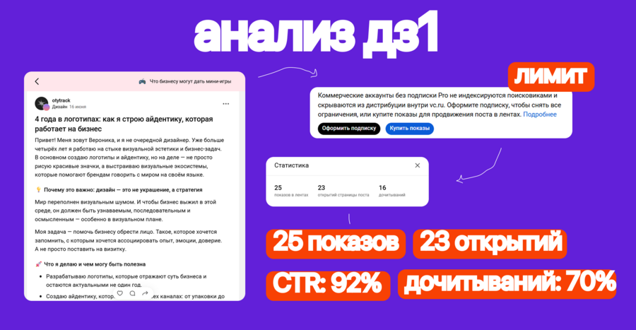 Несмотря на то что я вложилась в структуру, смысл и стиль статьи на VC.ru, она практически не получила охвата — 25 показов, 23 открытия, 16 дочитываний. Это хорошие показатели вовлечённости, но увидеть их смогли единицы. Платформа ограничивает видимость новых аккаунтов, и без подписки Pro публикации не попадают ни в поисковую индексацию, ни в ленты. Это важный инсайт: даже сильный контент не работает, если его никто не видит. Я недооценила, насколько платформы зависят от технического статуса автора, и теперь понимаю, что стратегию дистрибуции нужно выстраивать не только вокруг содержания, но и вокруг инфраструктуры: прогретые аккаунты, кросс-постинг, подписки и промо — это тоже часть дизайна контента.