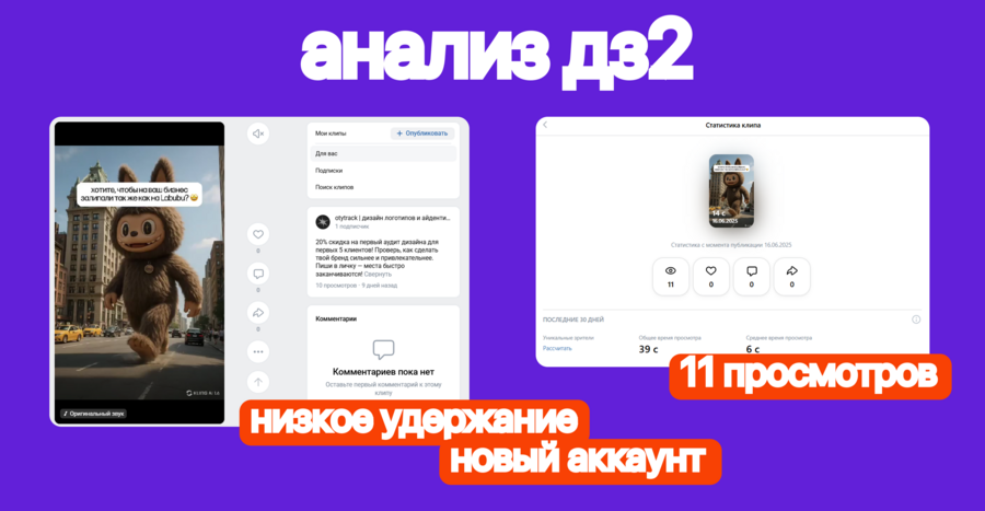 В видео для VK Клипов я сразу сделала ставку на продажу: скидка, чёткий CTA, оффер с дедлайном. Формально всё по канонам digital-маркетинга. Но на новом аккаунте без узнаваемости это не сработало. Охваты — минимальные, удержание — слабое, реакций — ноль. Сейчас я вижу, что продвижение дизайнера строится не на призывании «купи», а на истории, опыте, экспертности. Даже нейросети не спасут, если за брендом нет контекста и репутации. Поэтому в следующей итерации я выстраиваю воронку не через офферы, а через знакомство: личные истории, кейсы, эксперименты — всё, что создаёт образ специалиста, с которым хочется работать.