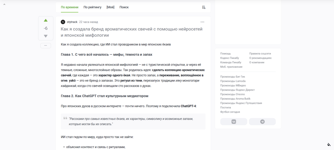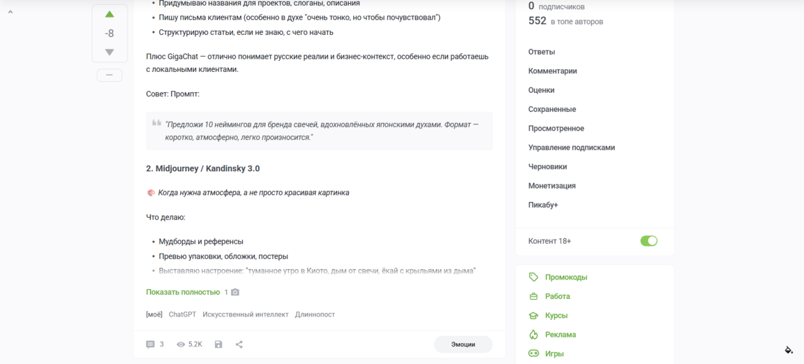 «Проанализируй, какие заголовки по дизайну заходят на Пикабу и Дзене, и выдай по 5 шаблонов для каждой» → Получила более кликабельные заголовки, адаптированные под тональность площадки — это дало органический трафик на старте.