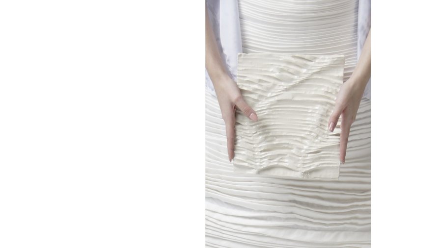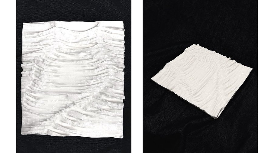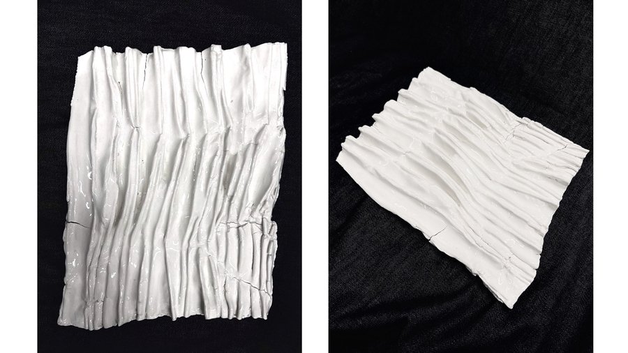 3.1. В дополнение к исследованию мной были изготовлены фарфоровые интерьерные панно, представляющие собой оттиск плиссированной ткани разного состава, в данном случае рубашечный хлопок и искусственная кожа. Покрыты с лицевой стороны прозрачной глазурью.
