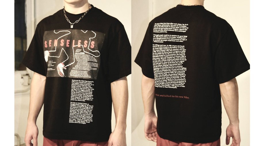 Этому посвящен принт на футболке, в основу которого лег разворот статьи из журнала Sports illustrated об этом культе.