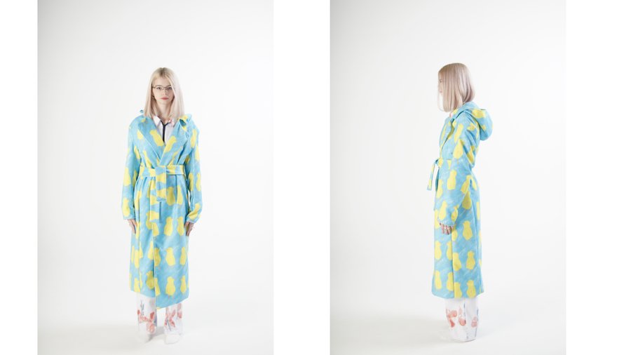 Пальто-халат с капюшоном на облегченном подкладе. Размер S-M, на рост от 175 см. Состав: 100% полиэстер.