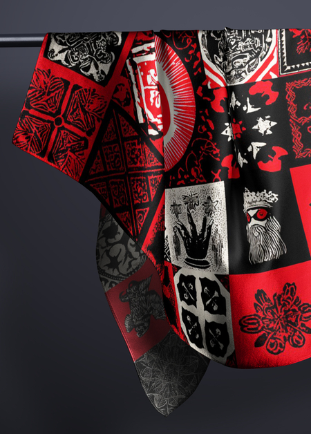 Промт: Elegant repeating pattern inspired by Imperial Russian aesthetics: double-headed eagles, ornate Orthodox church domes, and stained glass motifs. Rich color palette, golden accents, textile-inspired symmetry, detailed and decorative composition for silk scarf print. Blend of historical grandeur and artistic elegance.