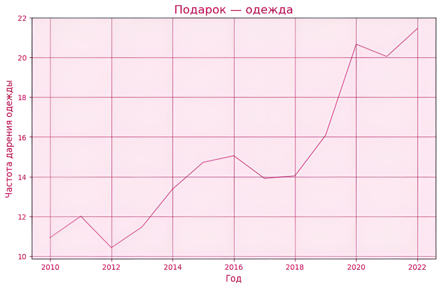Если я хочу сделать что-то необычное для молодого человека, то нужно посмотреть, какие подарки чаще дарятся. Я решила проанализировать, в какой год какой тип подарка больше или меньше пользовался спросом.