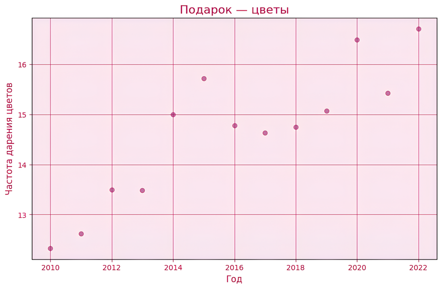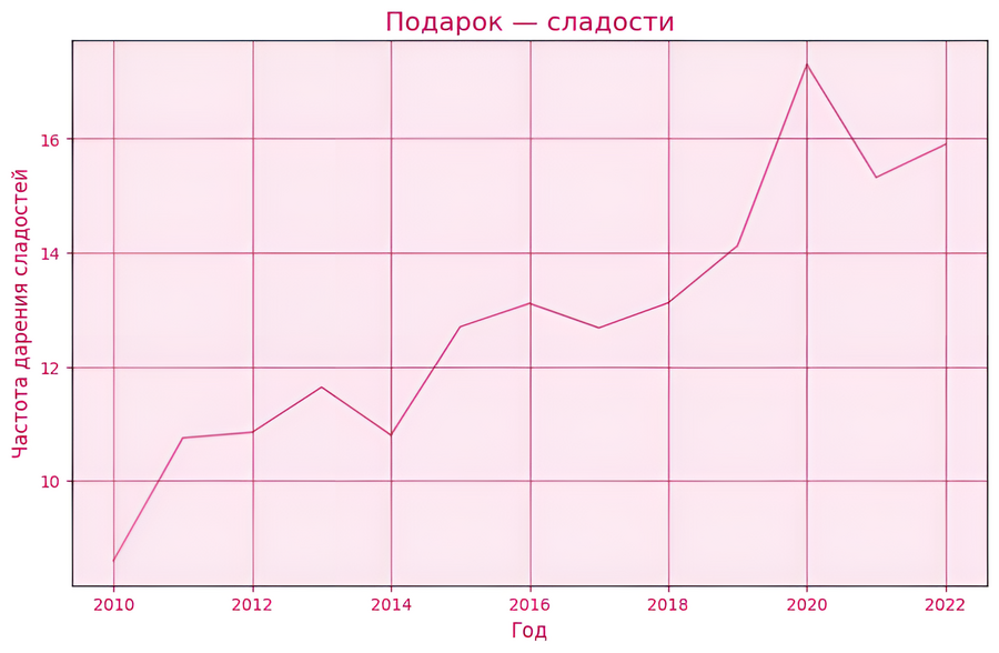 Сначала я создала точечную диаграмму, но потом подумала, что нагляднее будет именно график, как визуализация тенденций того или иного подарка или события.