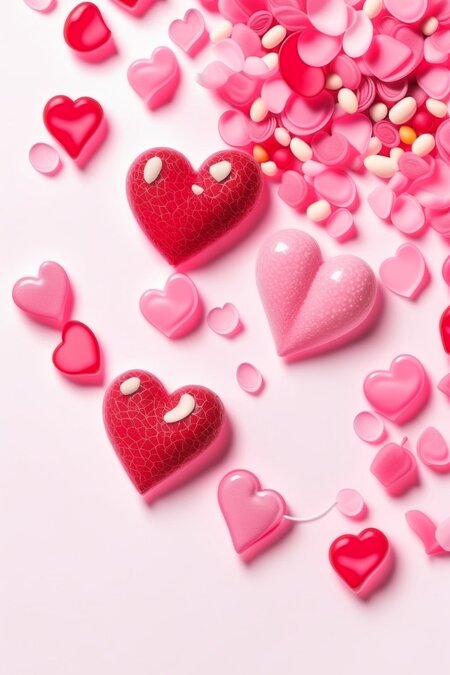 ——————————————————————————— Промпт обложки: Valentine’s day image on a white background with candy in the form of hearts in light pink and pink colours.