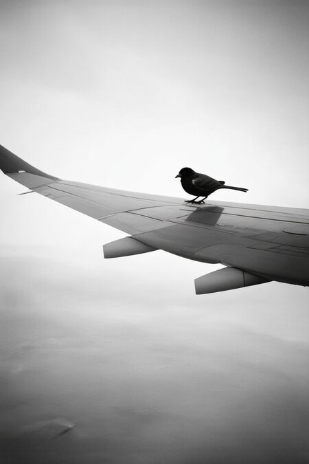 Для генерации обложки использовалась нейросеть Stablecog. Запрос «Black and white photo of bird staying on the wing of airplane»