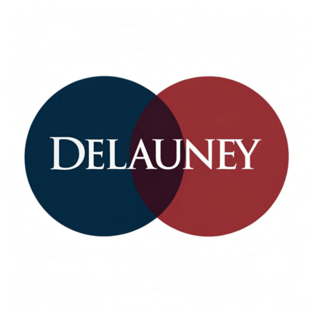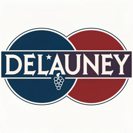 Create a minimalistic vintage logotype featuring word 'Delauney'. It should feature circles, one dark blue and the other dark red. Typography must appear solid, light and feature even figures. Design should be stylish and represent wine or other drink.
