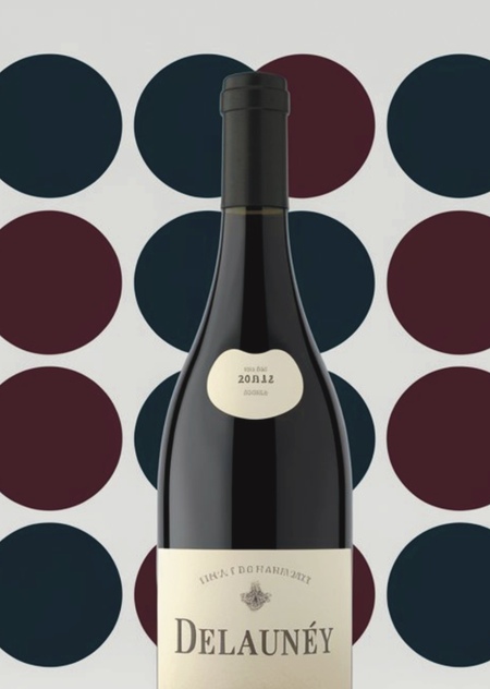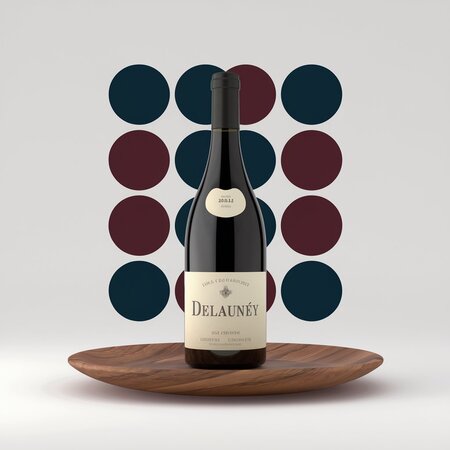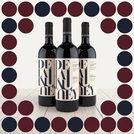 Make a few wine bottles, featuring word 'Delauney' prominently, fully rendered, pattern icluding dark red and dark blue circles. Vintage, minimalistic, clean, professional.
