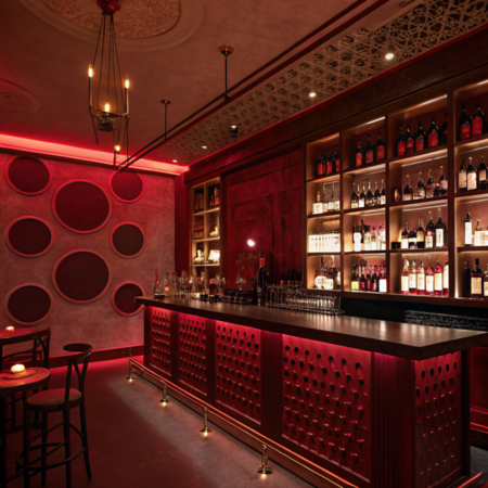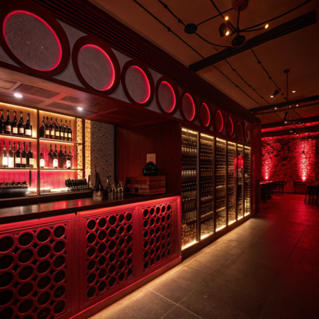 A bar space, dim lit wirg a dark red light, expensive wines all around, the amtosphere is elegant and vintage. There are minmalistic solid very solid circles as decorations on the walls. No small patterns.