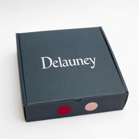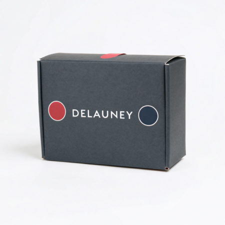 Make a food packaging, featuring word 'Delauney' clean and prominent. Dark red and dar blue circles no more than two on the box. The box itself is dark grey or black, minimalistic, functional, vintage, no smudge.