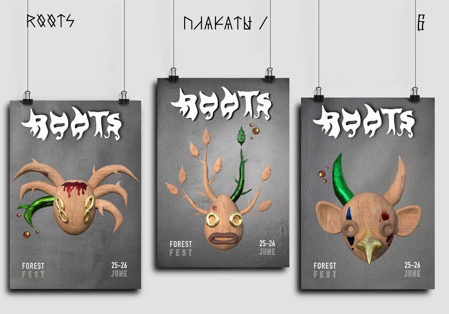 «Корни» — проект, созданный, чтобы отвлечь людей от тяготящей их рутины и предложить вспомнить про свою связь с природой. Мероприятие представляет собой лесной фестиваль с народными плясками, мастер-классами и обрядами. Проводится в первые выходные июня. В отличии от моего проекта с первого курса, в этой интерпретации я сделала стилистический акцент на сказочность и непосредственно природность.