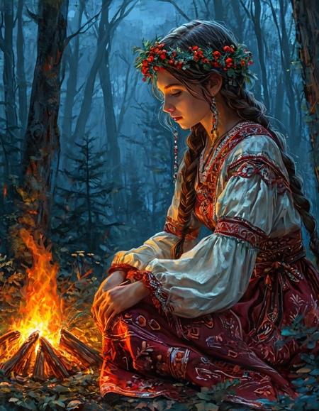 Промпт: девушка в славянской одежде и венке в ночном таинственном лесу рядом с костром иллюстрация // люди танцуют ритуальные танцы у костра, они в фольклорных масках и венках, вокруг ночной лес