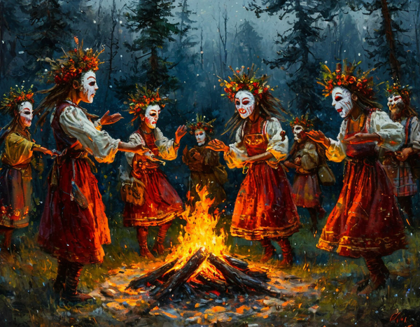 Промпт: люди танцуют ритуальные танцы у костра, они в фольклорных масках и венках, вокруг ночной лес, фото