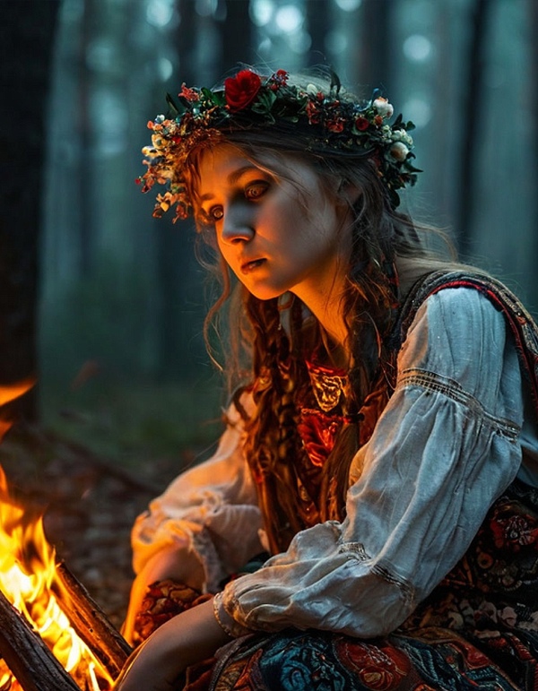 Промпт: девушка в славянской одежде и венке в ночном таинственном лесу рядом с костром, реалистичное фото